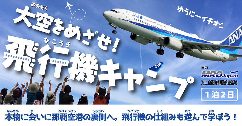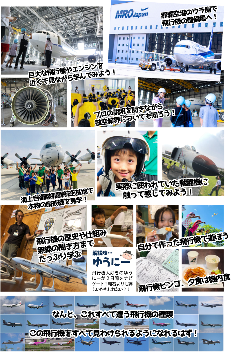 今回のテーマは、大空をかっこよく飛ぶあの「飛行機」。飛行機の仕組みや種類、航空業界について学びながら本物にもあう!1日目は飛行機整備場MRO-Japanの協力により、本物の飛行機に会いに那覇空港内の整備場へ、2日目は海上自衛隊の那覇航空基地で、普段は見ることができない航空基地の裏側を案内してもらおう!学ぶだけではなく、自分で作った模型飛行機で飛行大会とアクティブな活動もある特別な内容。